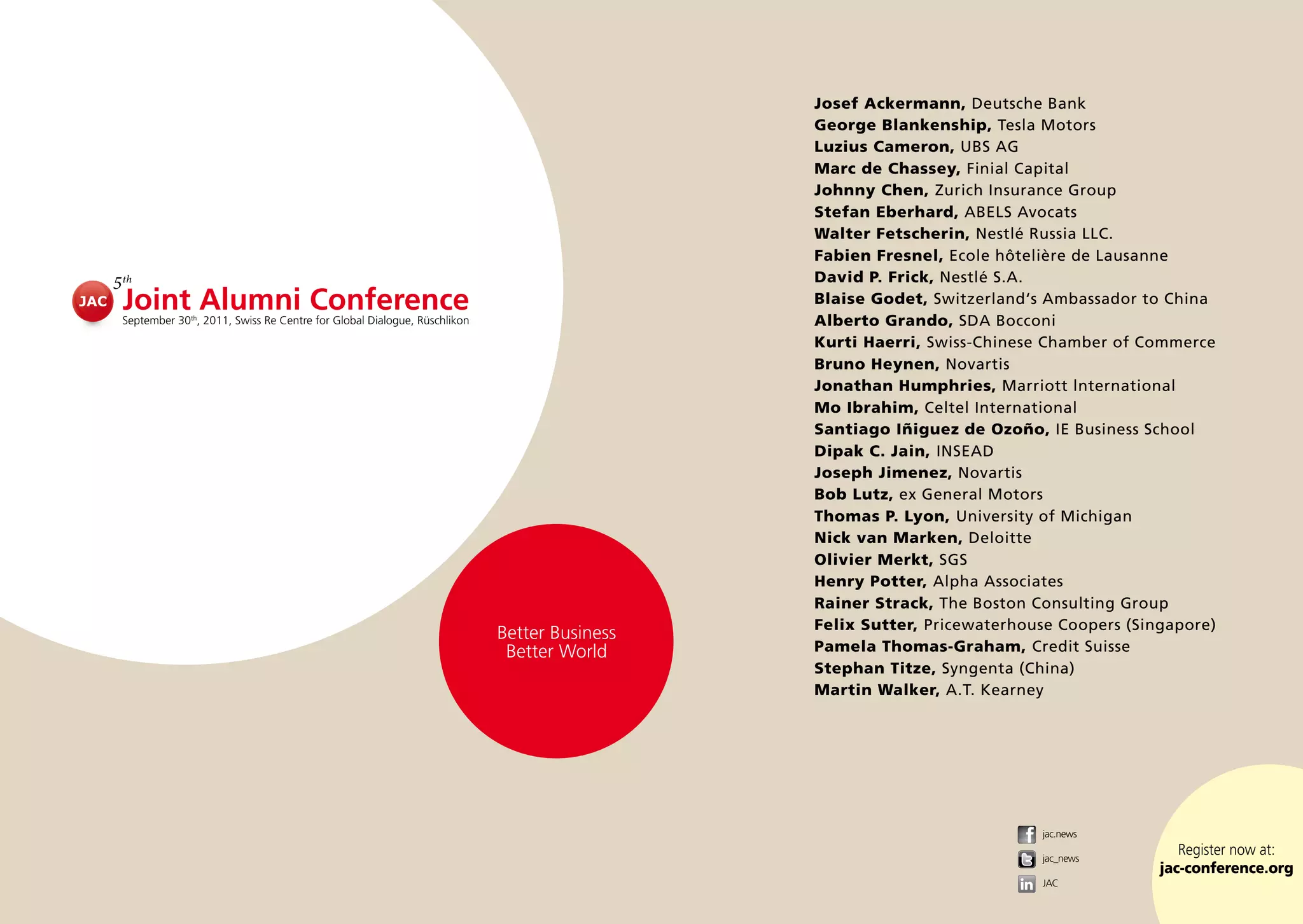 The document provides information about the 5th Joint Alumni Conference (JAC) that was held on September 30th, 2011 at the Swiss Re Centre for Global Dialogue in Rüschlikon. The one-day conference brought together over 300 business leaders and top executives from various industries and backgrounds to explore the future of business. A number of high-profile speakers from organizations like Deutsche Bank, Novartis, and General Motors presented on topics related to leadership, sustainability, innovation, and doing business in Asia and Russia. The event also featured panel discussions and networking opportunities for participants.