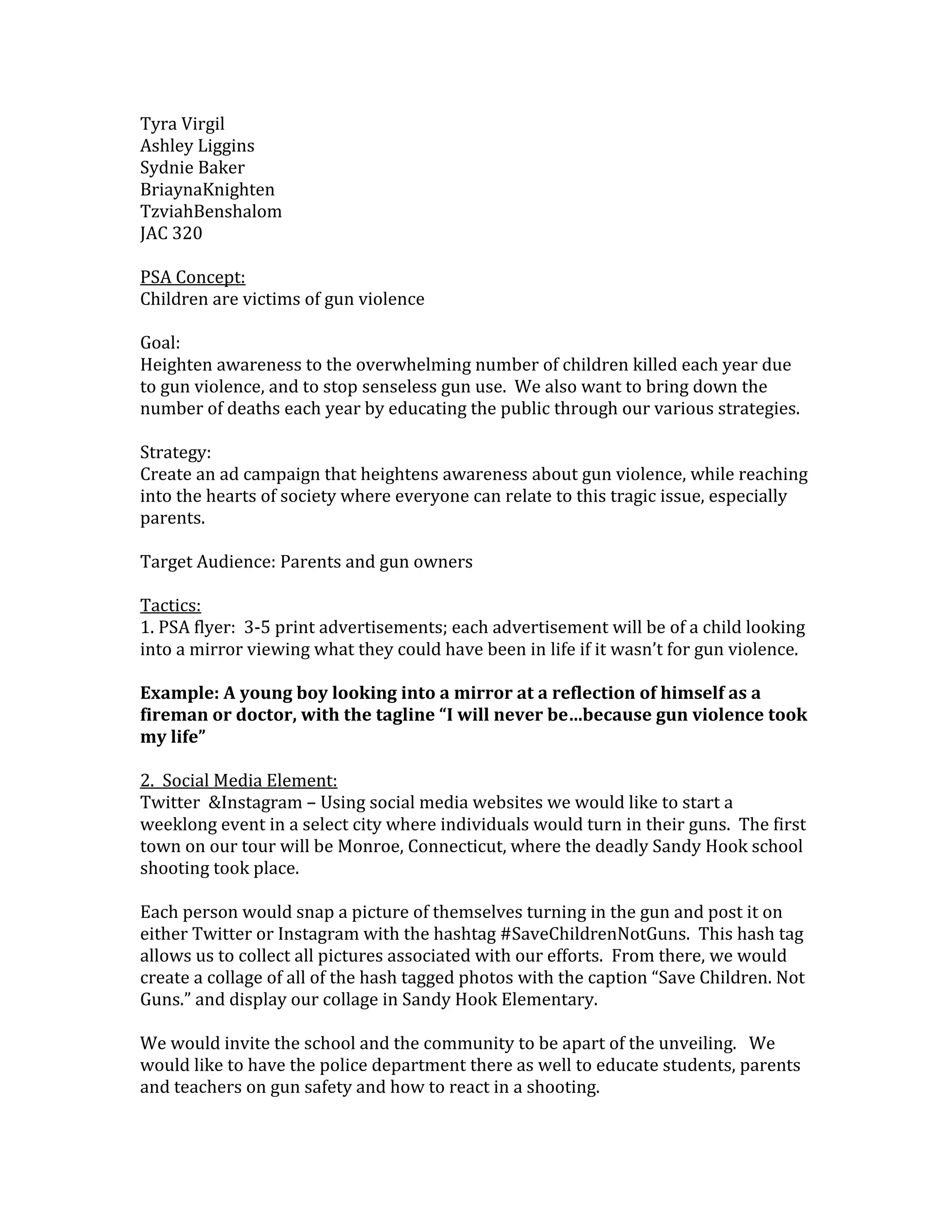 This public service announcement concept aims to raise awareness of gun violence against children and decrease related deaths each year. The goal is to educate the public through an ad campaign highlighting how gun violence has taken the lives of children, showing what their futures could have been. Tactics include print ads of children looking at reflections of their potential careers, a social media campaign in Monroe, Connecticut encouraging people to post photos of turning in guns with the hashtag #SaveChildrenNotGuns, a website displaying ads and tracking progress, and donating funds from collected guns to gun violence prevention organizations and youth programs.
