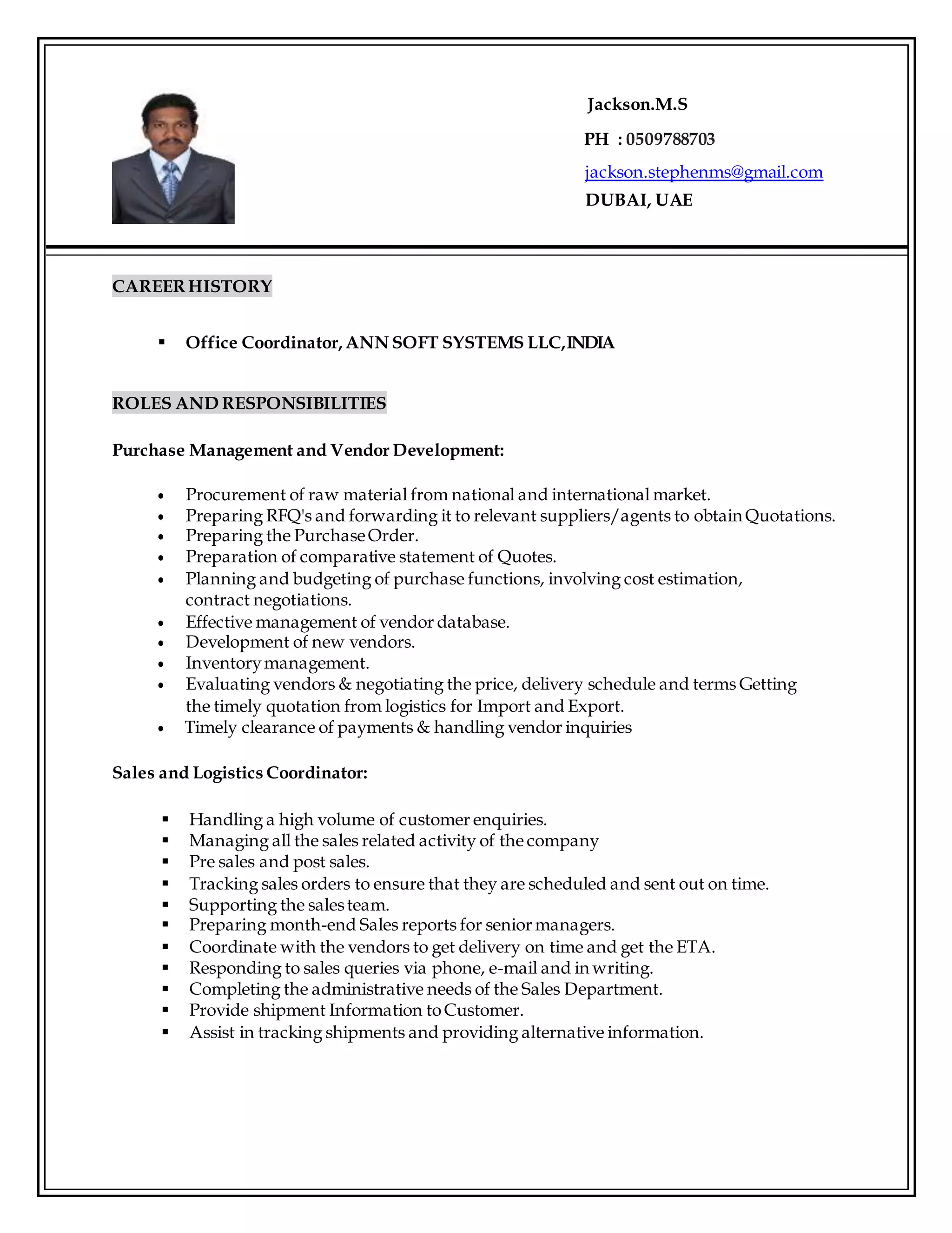 The document outlines the career history and qualifications of an office coordinator and sales and logistics coordinator based in Dubai, UAE. It details responsibilities in procurement, vendor management, sales support, and inventory management, highlighting key skills in vendor development and proficiency in Microsoft Office and ERP software. The individual holds a diploma in computer science and is fluent in English and Tamil.