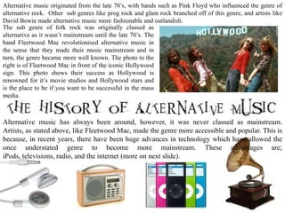 Alternative music originated in the late 1970s with bands like Pink Floyd influencing the genre of alternative rock. Subgenres like prog rock and glam rock emerged from alternative rock. Artists like David Bowie made alternative music more fashionable.