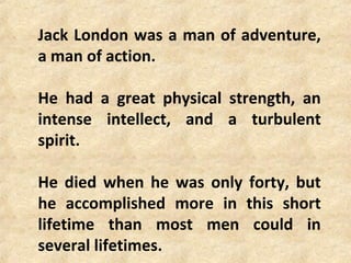 Jack London was an American author and adventurer known for writing adventure novels set in the Klondike Gold Rush such as Call of the Wild. He had a difficult childhood growing up in poverty in San Francisco. As a young man, he lived an adventurous life working as a sailor, gold prospector, war correspondent and experiencing hardship in Alaska. Despite only living until age 40, he wrote many popular novels drawing from his own life experiences and became a renowned and successful author.