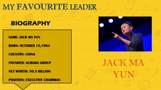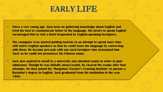 Jack Ma is the founder and former executive chairman of Alibaba Group, a Chinese multinational technology conglomerate. As a young man, he was passionate about learning English and would visit hotels frequented by English speakers. After graduating from college with a degree in English, he registered the domain name "chinapages.com" and started an early business that made $8 million within three years. Now, Jack Ma is one of the richest and most influential businessmen in China, known for his leadership of Alibaba Group and quotes about empowering others and embracing failure.