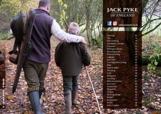 This document provides a catalog for Jack Pyke of England products including clothing, accessories, footwear and more. It highlights new technical garments like the Argyll, Galbraith and Rannock jackets as well as new accessories such as shooting socks and ties. The catalog provides product descriptions, materials used, colors and sizes available, and suggested retail prices for each item.