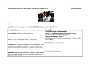 The document identifies several features of postmodernism seen in the "Jack Rabbit Slims" sequence from the film Pulp Fiction. These include intertextuality through references to Grease and Marilyn Monroe, parody through Travolta's character imitating his younger self, and pastiche shown in the recreation of Monroe's iconic scene from The Seven Year Itch. The sequence also exhibits reflexivity when Uma Thurman's character draws attention to the film screen, as well as bricolage through its mixing of different eras within one scene. There are examples of self-referentiality too, with nods to Travolta's previous work in Grease and the director's other films.