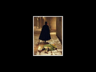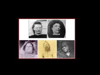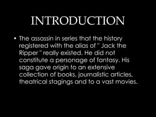 Jack the Ripper was a serial killer who operated in London in 1888. He murdered five prostitute women in the impoverished Whitechapel neighborhood. The killer was never identified, but was reported to be a well-dressed man who frequented the dark streets of Whitechapel where many prostitutes worked. His brutal attacks involved opening the victims' bodies and leaving their internal organs exposed, demonstrating precision like a surgeon. The crimes sparked widespread fear and interest that continues today through books, films and other works about the unidentified killer.