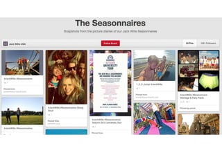 Jack Wills is a British clothing brand founded in 1999 that designs heritage-inspired clothing. It targets university students but its high prices suggest it mainly attracts wealthy students. While it emphasizes its British roots, most clothing is made in China. The brand is struggling with recent losses as it prepares for an IPO. Students criticize it as overpriced and contributing to stereotypes. A group of students analyzed the brand and developed concepts including using new technology like an app, expanding the Seasonnaires student ambassador program, and collaborating more with student unions on events.