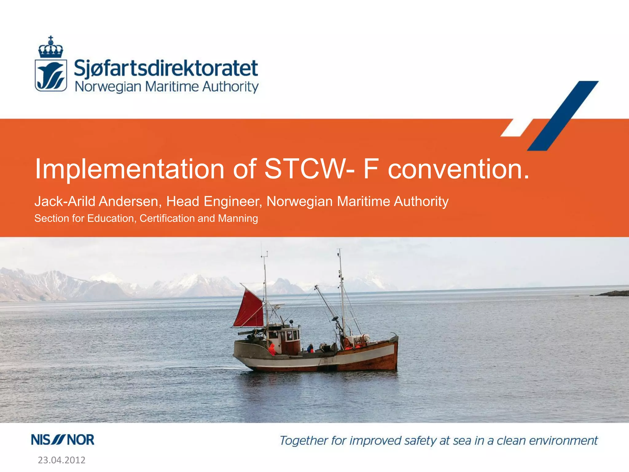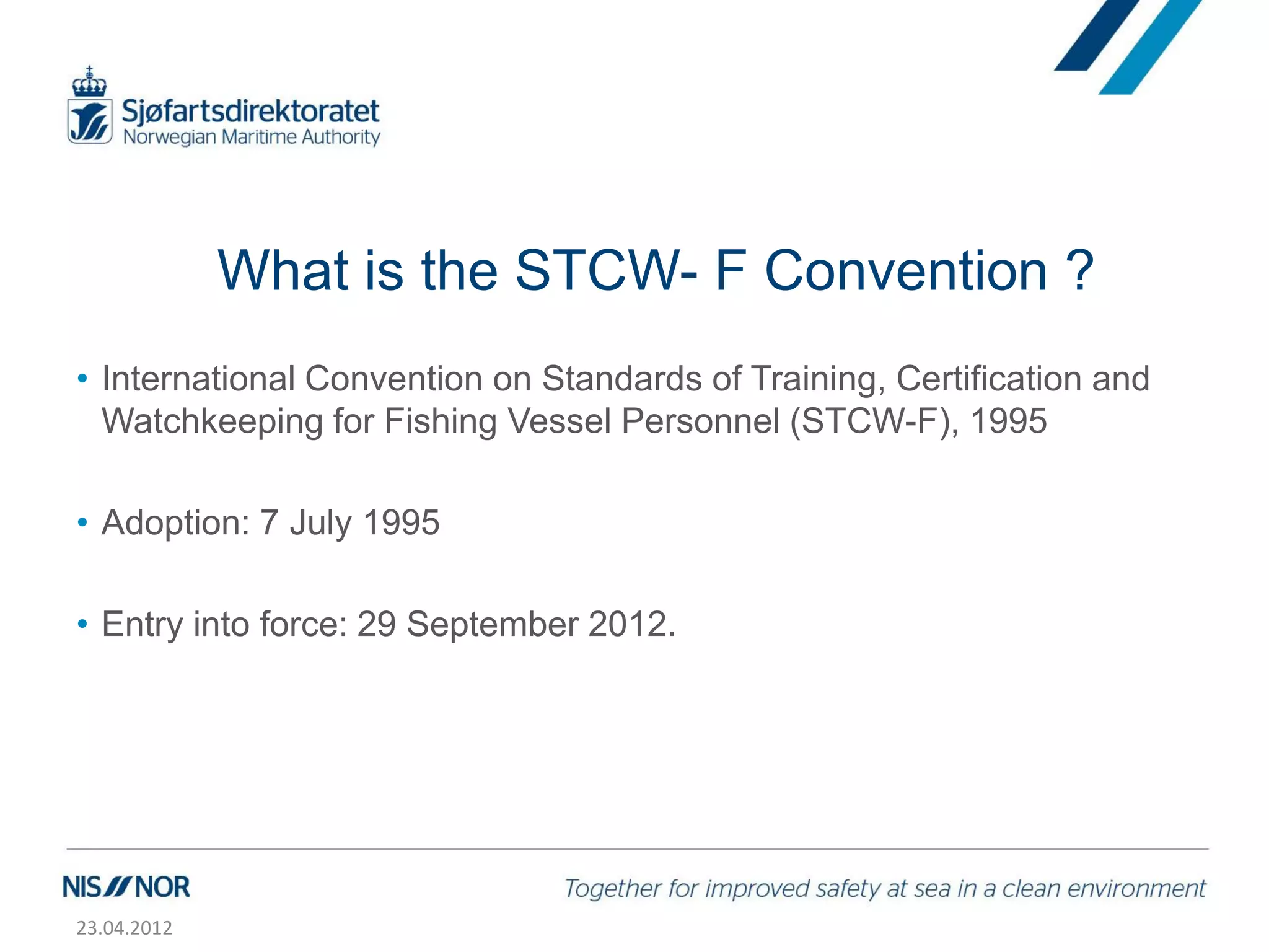 The document discusses Norway's implementation of the 1995 International Convention on Standards of Training, Certification and Watchkeeping for Fishing Vessel Personnel (STCW-F). The STCW-F sets minimum training requirements for crews on fishing vessels 24 meters or longer. Norway began implementing the STCW-F in 1998 by basing training for masters, chief engineers and officers on the STCW requirements. Norway also requires relevant sea service and safety training that meets or exceeds STCW-F standards. Norway's goal is to fully implement the STCW-F by January 2013, except for fishermen's basic safety training which will be compliant by January 2018.