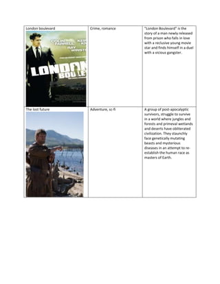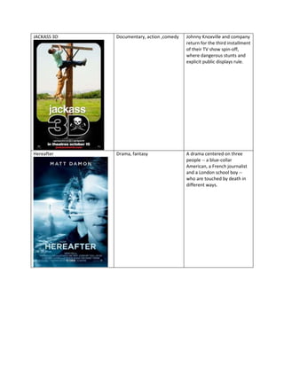 The document provides summaries for 20 movies spanning various genres including action, comedy, drama, sci-fi and crime. Some of the movies summarized are Jackass 3D, Hereafter, London Boulevard, The Andromeda Strain, How Do You Know, Yogi Bear and The Green Hornet.