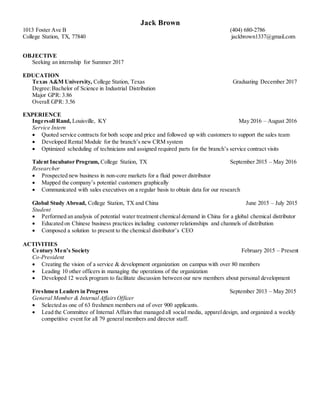 Jack Brown is seeking an internship for Summer 2017. He is a senior at Texas A&M University majoring in Industrial Distribution with a 3.86 major GPR and 3.56 overall GPR. His experience includes internships with Ingersoll Rand and Talent Incubator Program where he supported sales teams, developed systems, and performed market research. He also studied abroad in China analyzing potential markets. On campus, he is Co-President of Century Men's Society leading over 80 members and previously held leadership roles in Freshmen Leaders in Progress.