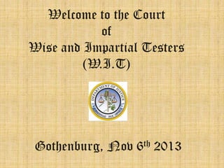 The document outlines a testing trial involving Jackie McDougall from the Sopra Group. It details the structure of the trial, including the roles of the accused, prosecution, and jury members. The event took place on November 6, 2013, in Gothenburg.