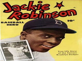 Jackie Robinson was the first African American to play in Major League Baseball, breaking the baseball color line in 1947 with the Brooklyn Dodgers. He faced considerable racism but had a successful career, retiring in 1956 and being inducted into the Baseball Hall of Fame. Robinson accomplished much more than just his baseball career, as he was also a family man, military veteran, and founder of the Jackie Robinson Foundation to help students attend college. His legacy continues to be honored today on Jackie Robinson Day each April.