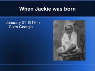 Jackie Robinson was the first African American to play in Major League Baseball, joining the Brooklyn Dodgers in 1947. He faced racial discrimination and adversity but helped pave the way for integration in professional sports. Some of his accomplishments include being Rookie of the Year in 1947, MVP in 1949, and the first African American inducted into the Baseball Hall of Fame.