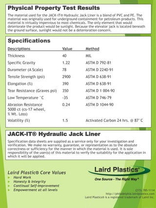 The JACK-IT® Hydraulic Jack Liner is an alternative to PVC pipe for hydraulic elevator jack installation. It protects the hydraulic system from contaminants, is corrosion resistant, replaces rigid PVC pipe, and is non-conductive. Made from a blend of PVC and PE, it is impervious to chemicals and has specifications including a thickness of 40 MIL and tensile strength of 2900 psi.