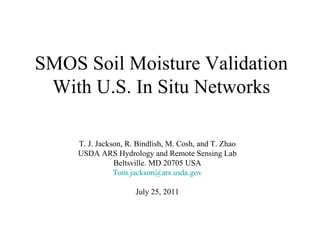 The document summarizes the validation of soil moisture products from the SMOS satellite using in situ soil moisture networks in the US. It finds that SMOS soil moisture retrievals have root mean square errors similar to or better than those of AMSR-E soil moisture products, approaching the target accuracy of 0.04 m3/m3. However, some overestimations in SMOS soil moisture are correlated with precipitation events and may be due to differences in measurement depth between SMOS and in situ sensors. Additionally, the values and variability of vegetation optical depth (tau) retrieved by SMOS do not correlate well with estimates based on NDVI, indicating issues with the tau parameter.