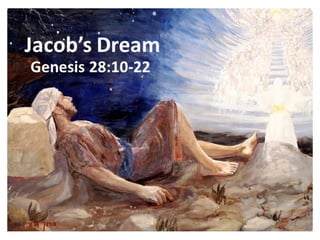 This document discusses Genesis 28, focusing on Jacob as the main character and his significant spiritual experiences. It elaborates on themes such as God's covenant with Jacob, the directives given by Isaac, and the implications of Jacob's dream of a ladder reaching heaven. The study highlights the importance of divine communication and the transformational experience Jacob undergoes during a seemingly ordinary journey.