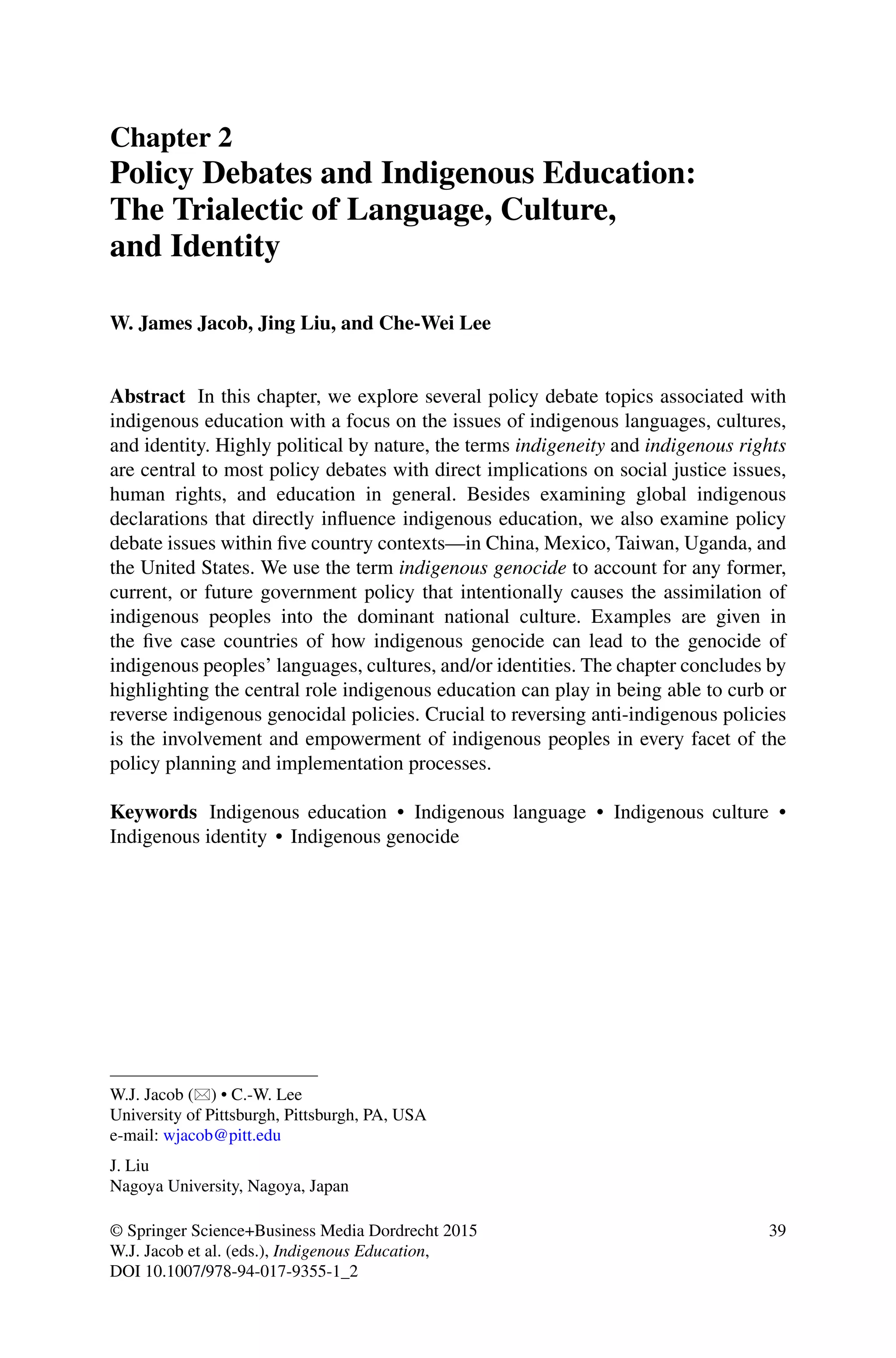 This chapter examines policy debates surrounding indigenous education, focusing on the interplay of language, culture, and identity across different national contexts, including China, Mexico, Taiwan, Uganda, and the United States. It highlights the concept of 'indigenous genocide' as government policies lead to the assimilation of indigenous peoples and erasure of their languages and cultures. The authors argue for the empowerment of indigenous peoples in educational policy-making to counteract the negative impacts of assimilation and to preserve their identities.