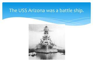 The USS Arizona was a battleship that was bombed at Pearl Harbor on December 7, 1941, resulting in 1,177 men dying and only 334 surviving the attack. The USS Arizona remains located at Pearl Harbor on Oahu as a memorial to those lost in the attack.