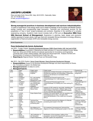 Jacopo Licheri has over 12 years of experience in the energy sector, with expertise in business development, project management, and energy efficiency. He holds a PhD in Energetics from the University of Rome and an Executive MBA from SDA Bocconi School of Management. Currently he works as a Business Development Manager for Poyry Switzerland, coordinating marketing and sales activities in Europe, the Middle East, and Latin America.