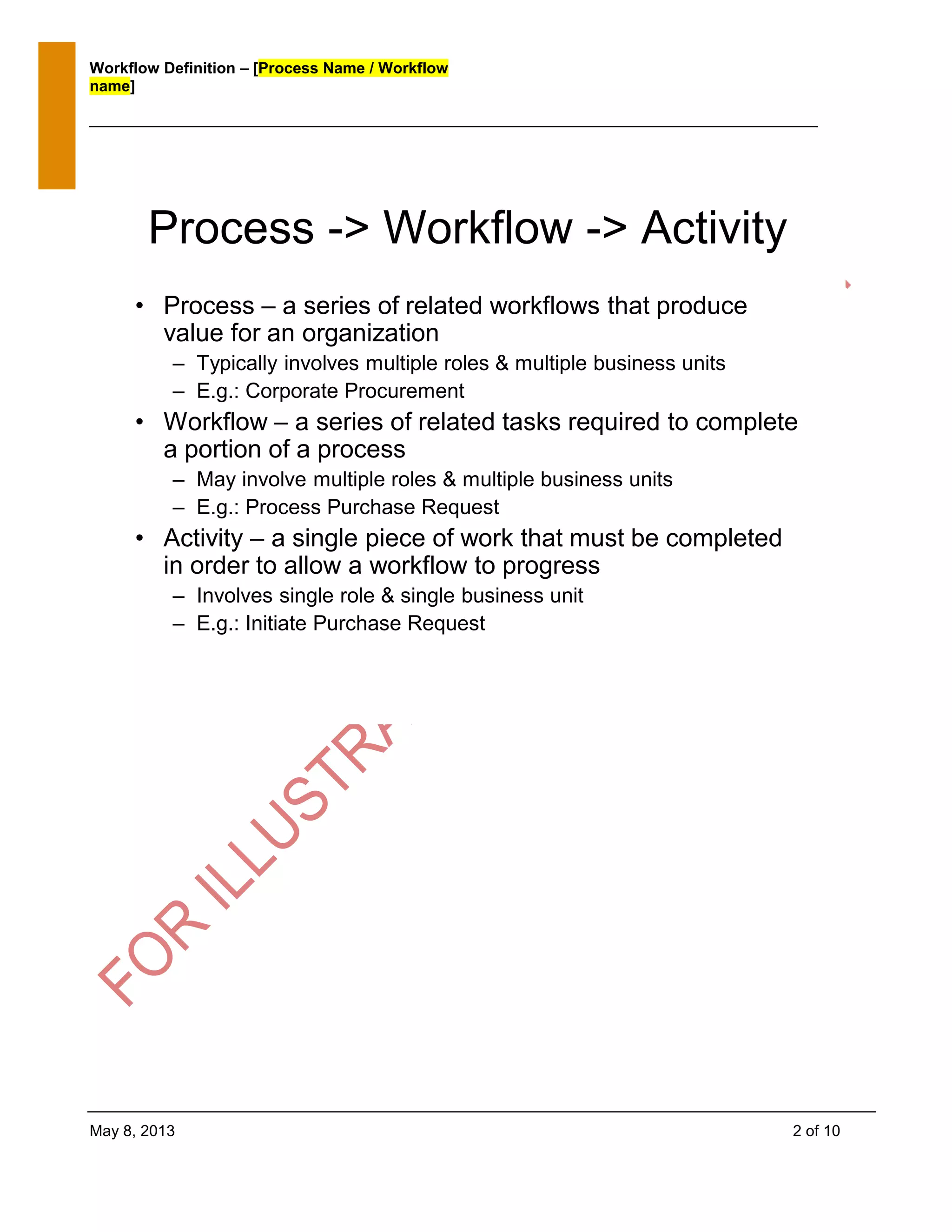 The document outlines a structured approach to workshop facilitation focusing on task definition, inputs, outputs, roles, and performance indicators. It differentiates between processes, workflows, and activities, providing a framework for defining and managing workflows effectively. Additionally, it emphasizes the importance of stakeholder involvement, business rules, data management, and decision support requirements throughout the workflow process.