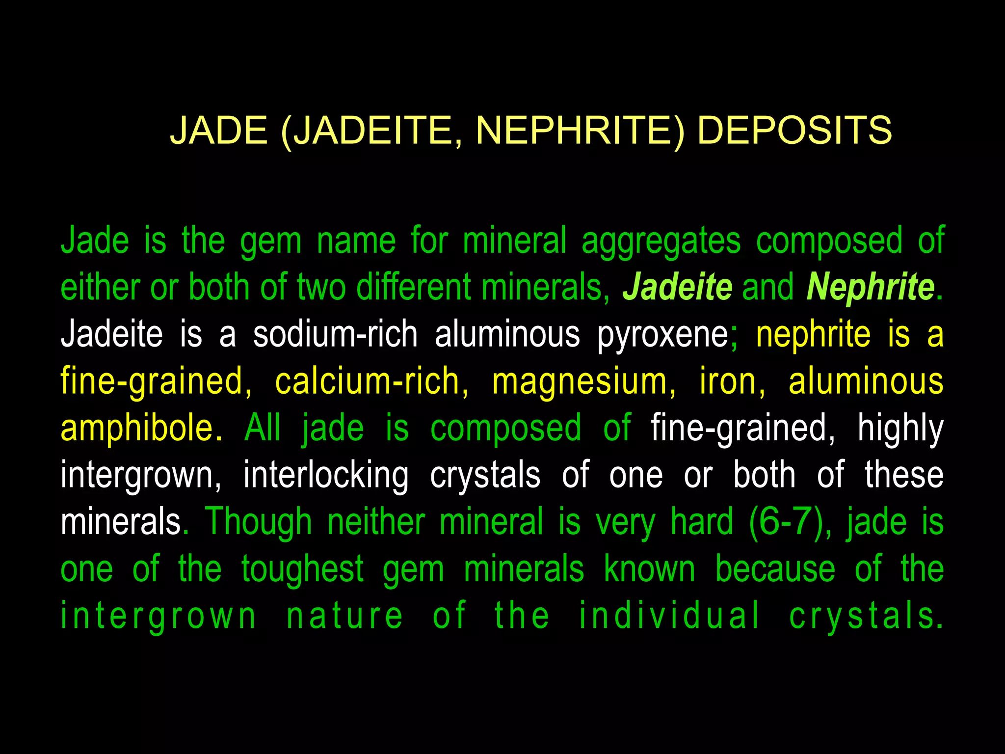 Jade, comprising jadeite and nephrite, is a tough gem known for its strength and variety of colors, with nephrite being more common than the rarer jadeite. Both minerals are primarily sourced from specific geological formations and can be found in regions like Myanmar, Canada, and the USA. The document also discusses the historical significance, cultural misunderstandings, and the mining processes of jade and its variants, emphasizing the unique properties of each type.