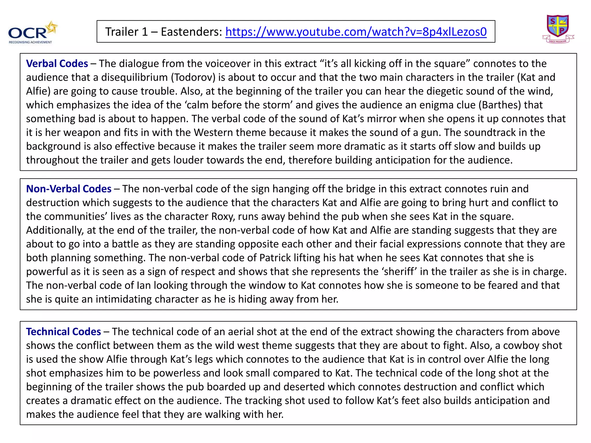 This document contains an analysis of three soap opera trailers. Key points analyzed include verbal codes like dialogue, non-verbal codes like facial expressions, and technical codes like camera shots. For the first trailer, the author notes the effective use of non-verbal codes that connote destruction. They would repeat this to build suspense. Fast cuts between shots in the second trailer create anticipation, which the author wants to replicate. Clothing placed on characters in the third trailer is a metaphor the author aims to reproduce to achieve drama. Camera movement is also praised and wished to be imitated.