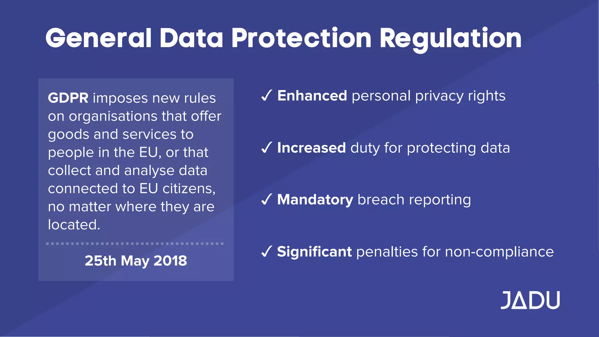 The document outlines the requirements of the General Data Protection Regulation (GDPR), effective May 25, 2018, which mandates enhanced privacy rights for EU citizens and increased responsibilities for organizations handling personal data. Key measures include data access rights for individuals, mandatory breach reporting, and stringent data management protocols, with specific focus on consent and security practices. Organizations are advised to audit their data practices, ensure compliance, and establish clear privacy policies to protect personal data.