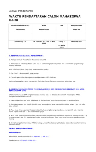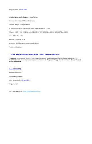 Dokumen ini memberikan informasi tentang jadwal dan prosedur pendaftaran calon mahasiswa baru di Universitas Al Azhar Indonesia, termasuk syarat pendaftaran dan kesempatan masuk tanpa tes. Pendaftaran dibagi menjadi beberapa gelombang dengan tanggal tertentu dan terdapat jalur khusus untuk siswa berprestasi. Selain itu, terdapat informasi mengenai ujian seleksi bersama untuk perguruan tinggi swasta.
