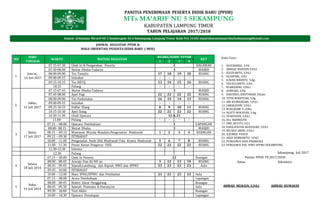 Dokumen ini merinci kegiatan Penerimaan Peserta Didik Baru (PPDB) dan Masa Orientasi Siswa (MOS) di MTs Ma'arif NU 5 Sekampung, Kabupaten Lampung Timur untuk tahun ajaran 2017/2018. Kegiatan dilaksanakan selama beberapa hari dengan jadwal yang mencakup berbagai kegiatan seperti tes, sholat, apel pagi, dan pengenalan lingkungan madrasah. Dokumen ini juga mencantumkan nama-nama tutor yang terlibat dalam kegiatan tersebut.