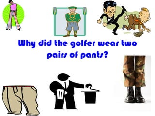 This short document contains a series of jokes told in single sentences. The jokes poke fun at golfing, math, state names, laundry detergent brands, and Santa Claus by playing on words and phrases associated with those topics to create humorous puns and double meanings.