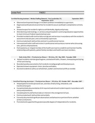 Jaezza Ford is a certified nursing assistant with over 9 years of experience caring for the elderly and children. She has worked in various roles including as a health support tech, hospital sitter, and certified nursing assistant. Her objective is to obtain a position as a certified nursing assistant with Veteran Affairs where she can utilize her skills and certification to provide dignified care to residents. She is compassionate and personable with extensive training in areas such as patient care, vital signs monitoring, privacy regulations, and medication administration.