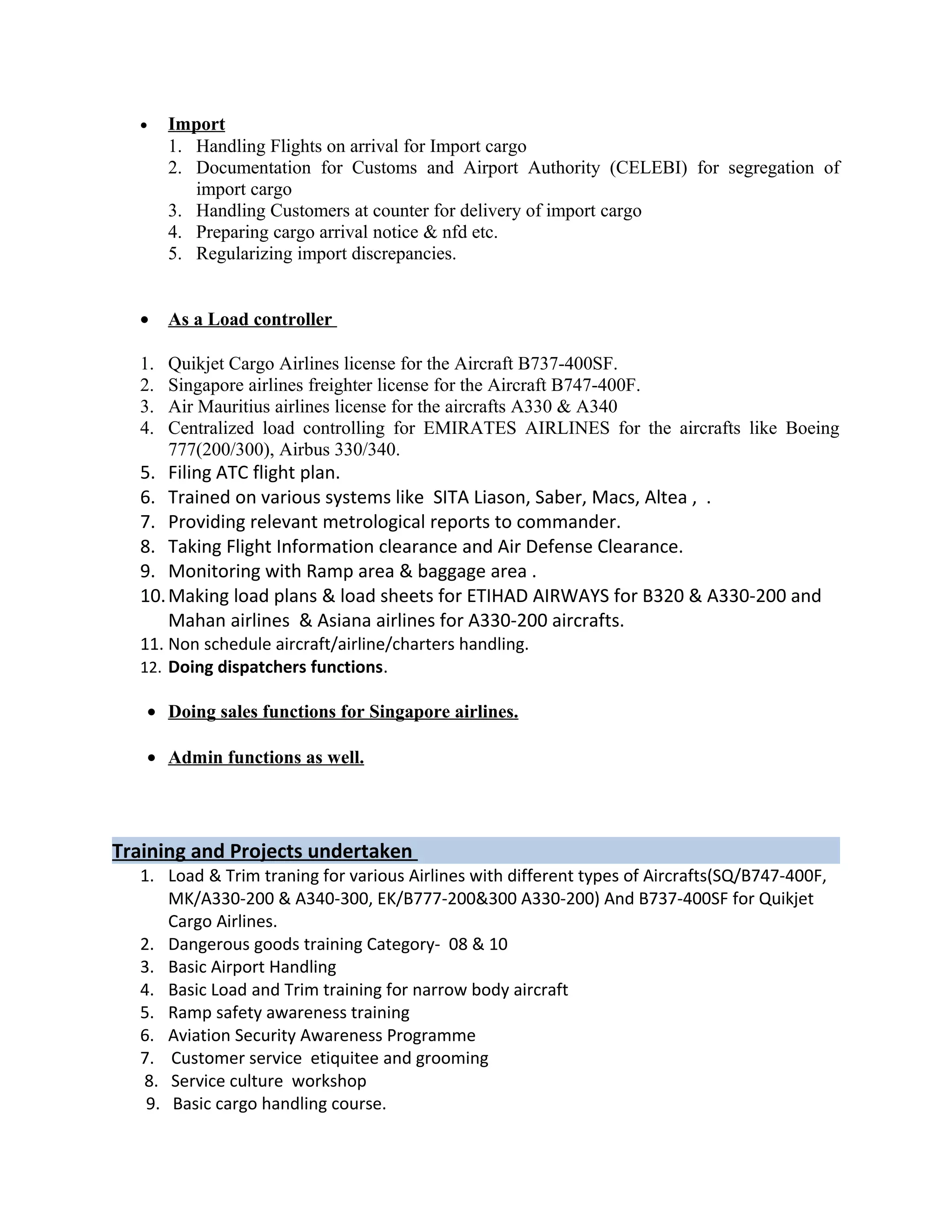 This document is a curriculum vitae for S.Jagadish Kumar summarizing his personal and professional experience. It includes his educational background with a graduate degree in commerce, over 10 years of experience in cargo operations and load controlling for various airlines, and responsibilities managing export and import cargo handling, documentation, and dispatching functions. It also lists his qualifications, skills, and hobbies to provide a full profile for potential employment opportunities.