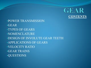 The document discusses various topics related to gear design and gear trains. It defines gears and their basic components such as teeth and axes. It describes different types of gears including spur gears, helical gears, bevel gears, worm gears, and rack and pinion gears. It also discusses gear ratios, velocity ratios, interference in gears, and different types of gear trains such as simple, compound, and planetary gear trains. The document provides illustrations and explanations of each gear type and gear train.