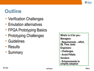 This document discusses leveraging low-cost FPGA prototyping for validation of highly threaded server-on-chip designs. It outlines the increasing verification challenges for such designs due to their large size, high performance, and number of threads. FPGA prototyping provides faster simulation speeds compared to software simulation and emulation for validating complex multi-core, multi-threaded server-on-chip designs. The document provides guidelines on FPGA prototyping and discusses the results and benefits it can provide for both engineering teams and management.