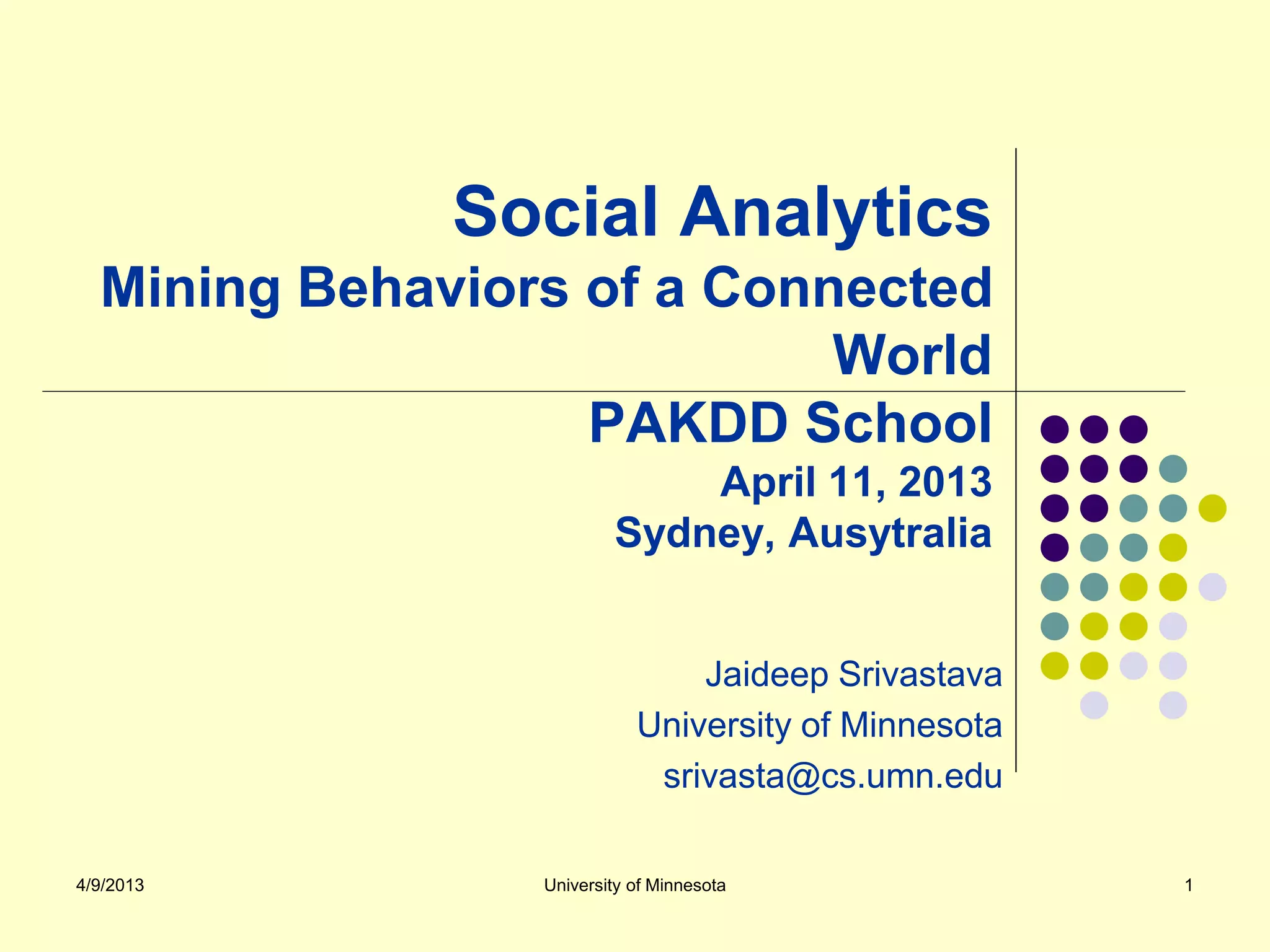 This document provides an outline for a course on social analytics. The course will have 3 modules that cover: (1) an introduction to social analytics and examples of social computing systems, (2) computational online trust, key influencers, and information flow in networks, and (3) analysis of clandestine networks and game analytics. The document also provides background information on social network analysis and its successes in both classical social sciences and more recent web-based applications.