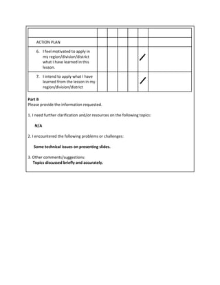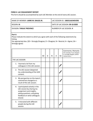 This form summarizes a Learning Action Cell (LAC) engagement session for member Jaime M. Daileg Jr. The session covered topics on school leadership and management (SLM). Member Daileg agreed that he learned from his colleagues, the session deepened his understanding of SLM topics, and he felt motivated to apply what he learned back in his region. The only challenge reported was some technical issues presenting slides during the session.