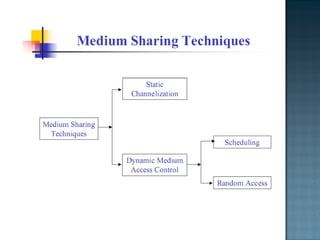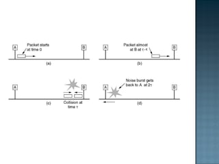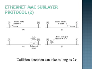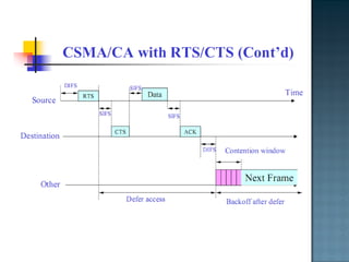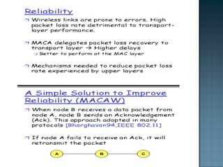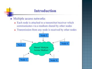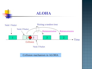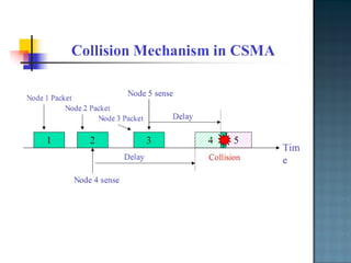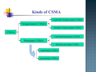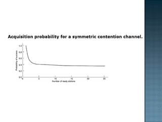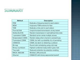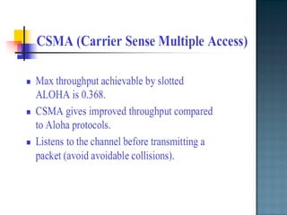 The document discusses MAC protocols for broadcast networks. It covers topics like CSMA, CSMA/CD, and how they work. It explains assumptions like the collision model and how protocols determine channel access. It also compares the performance of different protocols in terms of channel utilization and delay under varying load levels. Collision-free protocols are more efficient at high loads while contention-based protocols have lower delay at low loads.