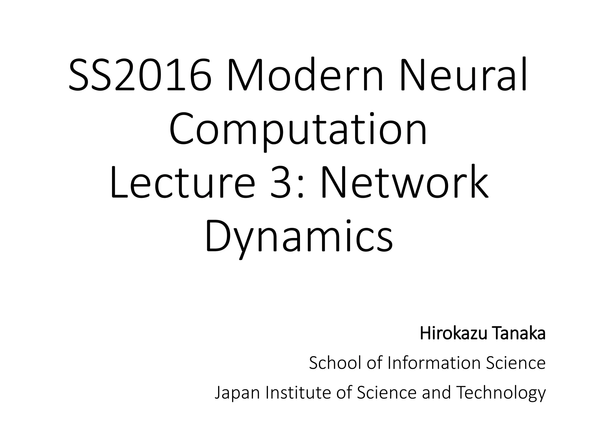 The document summarizes key concepts about the Hopfield model, an attractor neural network model inspired by physics. It discusses how memory is stored in the symmetric connectivity matrix through Hebbian learning of stored patterns. During recall, the network dynamics relax toward one of the stored memory patterns as an attractor state. This can be modeled deterministically or stochastically. The number of memories an N-neuron network can reliably store is approximately 0.15N.