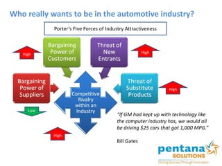 The document discusses how automotive companies can gain a competitive advantage by leveraging big data analytics to better understand customer demand, monitor corporate performance, and identify new opportunities. It provides examples of how General Motors, Ford, and Toyota are already using big data from sensors in vehicles and other sources to improve products and services. The document argues that tapping large sources of data will help automotive companies find new ways to differentiate themselves and stay ahead in a highly competitive industry.