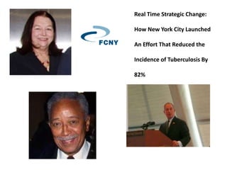 New York City launched an effort to reduce tuberculosis that led to an 82% decrease in cases. The effort focused on smart choices, commitment from individuals, and informed decisions and strategic actions from the community. It employed six principles of real time strategic change to help individuals achieve their full potential.