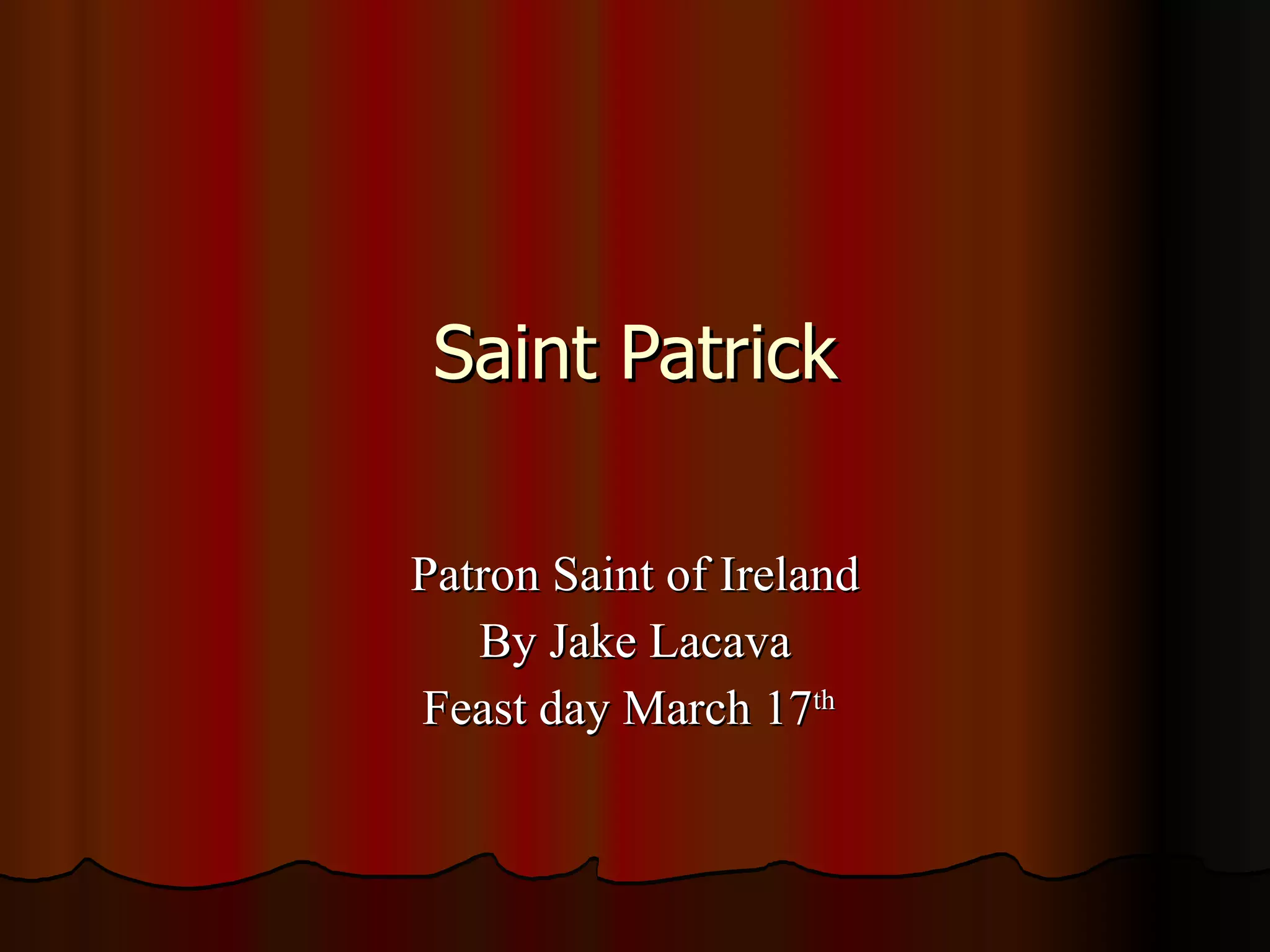 Saint Patrick is the patron saint of Ireland. He was born in England in 387 and was captured and enslaved in Ireland for six years as a teenager, where he found religion. An angel appeared to him telling him his ship was ready, and he escaped, returning to England. He later studied to become a priest and bishop and was sent to Ireland to spread Christianity, where he had great success, converting most of Ireland and building churches and schools before his death in 461.
