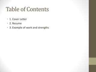 This document is Jake Winicki's portfolio containing his cover letter, resume, and examples of his work and strengths. The resume shows that Jake is studying finance at Northwood University and had an internship at Raymond James as a financial advisor. He has worked various jobs including as a merchandiser, ball boy for college sports, and baseball assistant coaching youth players. Jake has received honors for his baseball playing and academic achievements as a four year free enterprise and athletic scholar at Northwood University.