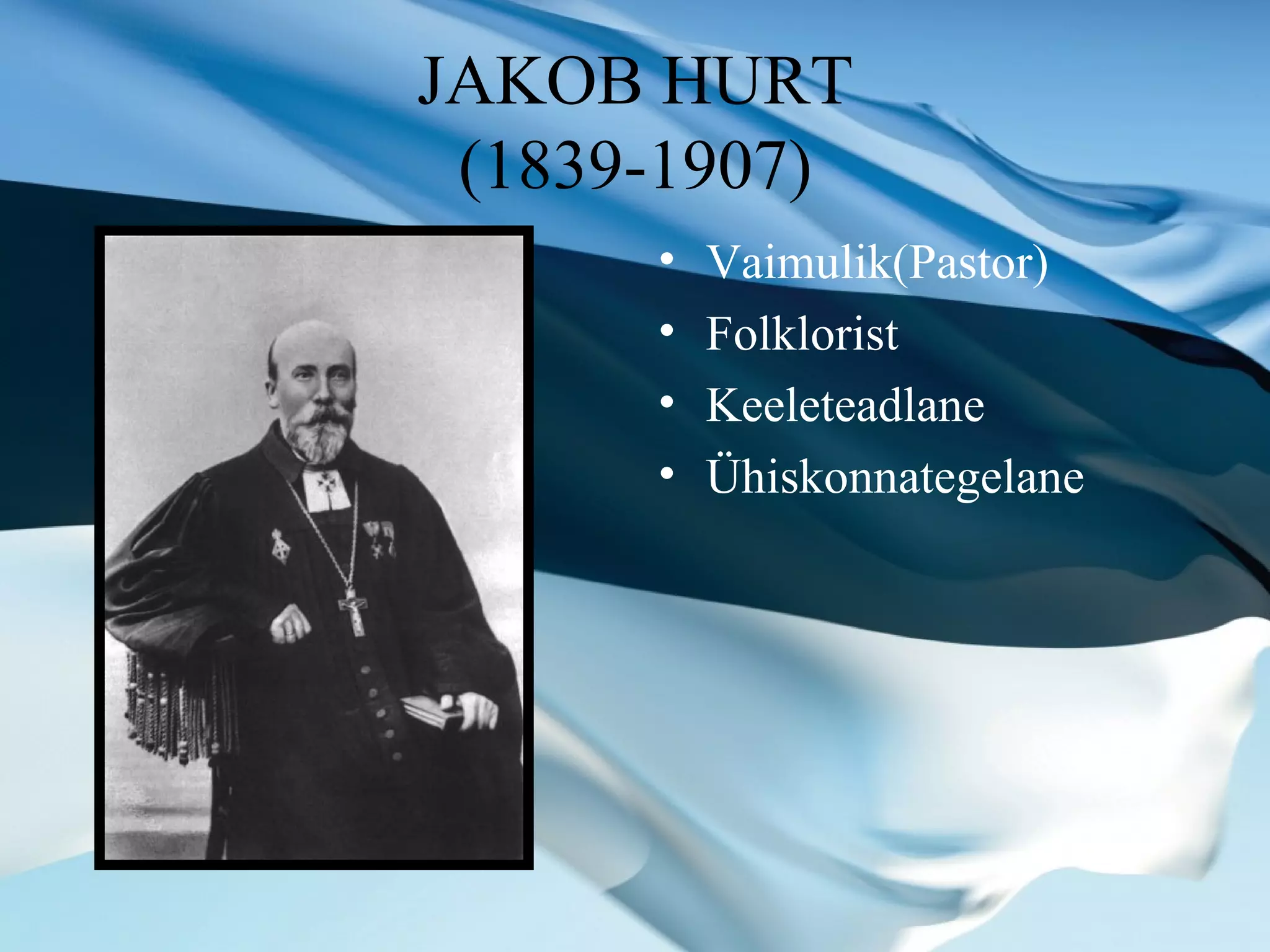 Haridus Himmaste külakool 1849– 18 52 Põlva kihelkonnakool 1853– 18 5 4 Tartu kreiskool 1855–58 Tartu gümnaasium 1859–1864 usuteadus Tartu ülikoolis 1865 sai teoloogiakandidaadi kraadi 1 886 jõudis Helsingi Ülikoolis doktori kraadini keeleteaduse alal "Eestlased ei ole mitte kärbsed, kes täna sünnivad ja homme surevad, vaid üks vana ja visa rahva sugu, kes ammu juba maailmas on elanud ja ka pärast meid veel kaua kestma saab." (Jakob Hurt)