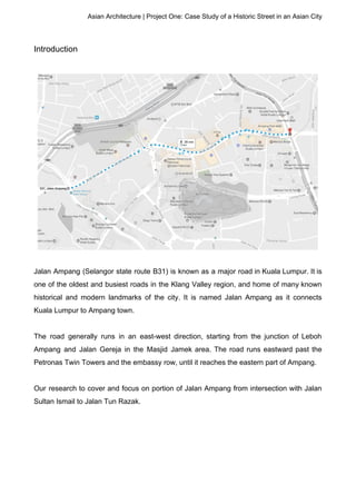 The document is a case study of Jalan Ampang, a historic street in Kuala Lumpur, detailing its evolution from a tin-mining route to a significant urban artery housing embassies and landmarks like the Petronas Twin Towers. It traces the socio-cultural, architectural, and commercial development of the area, highlighting key historical events and architectural styles that reflect the city's growth. The study concludes by emphasizing the transformative journey of Jalan Ampang through various phases of Kuala Lumpur's history.