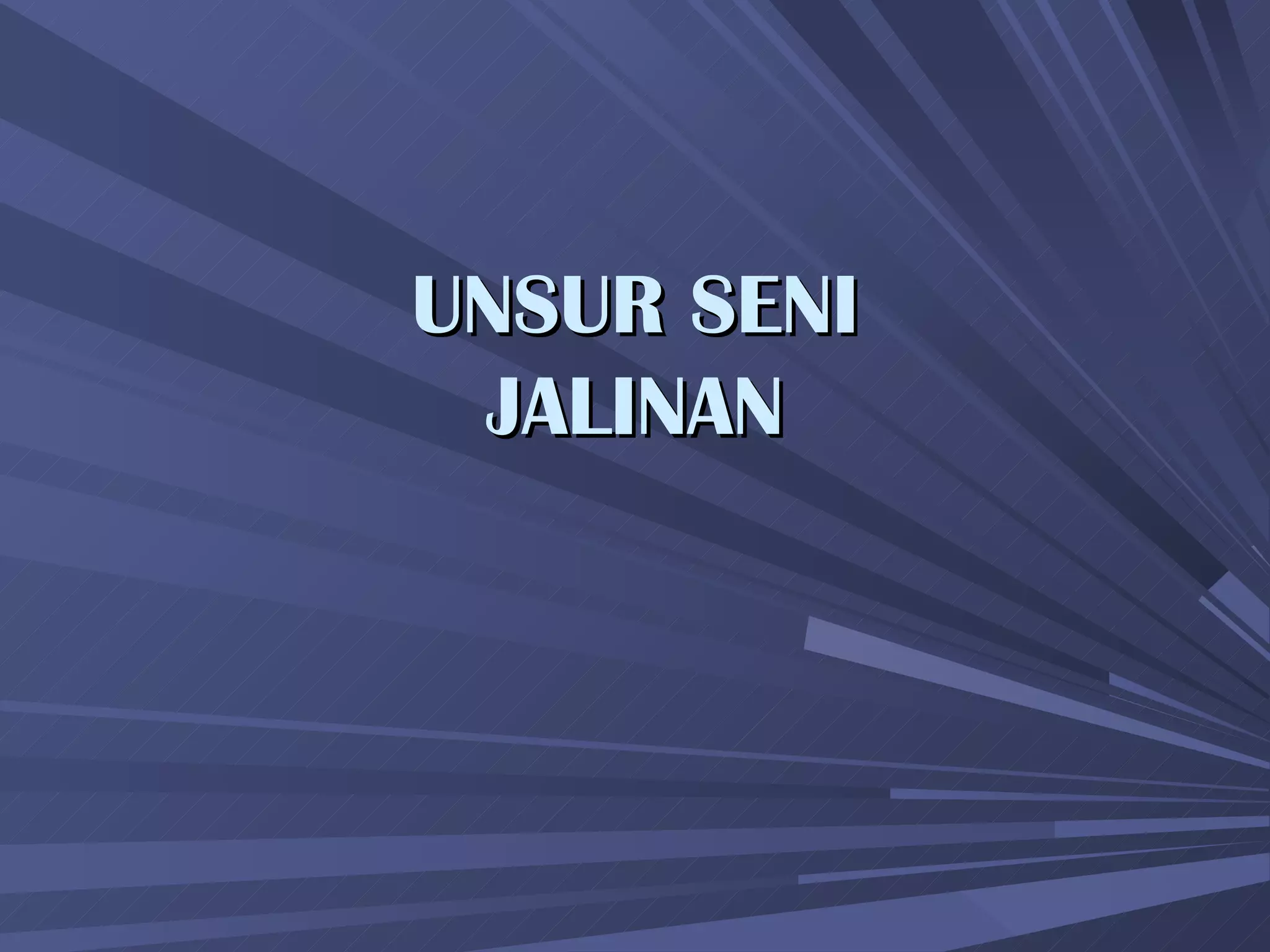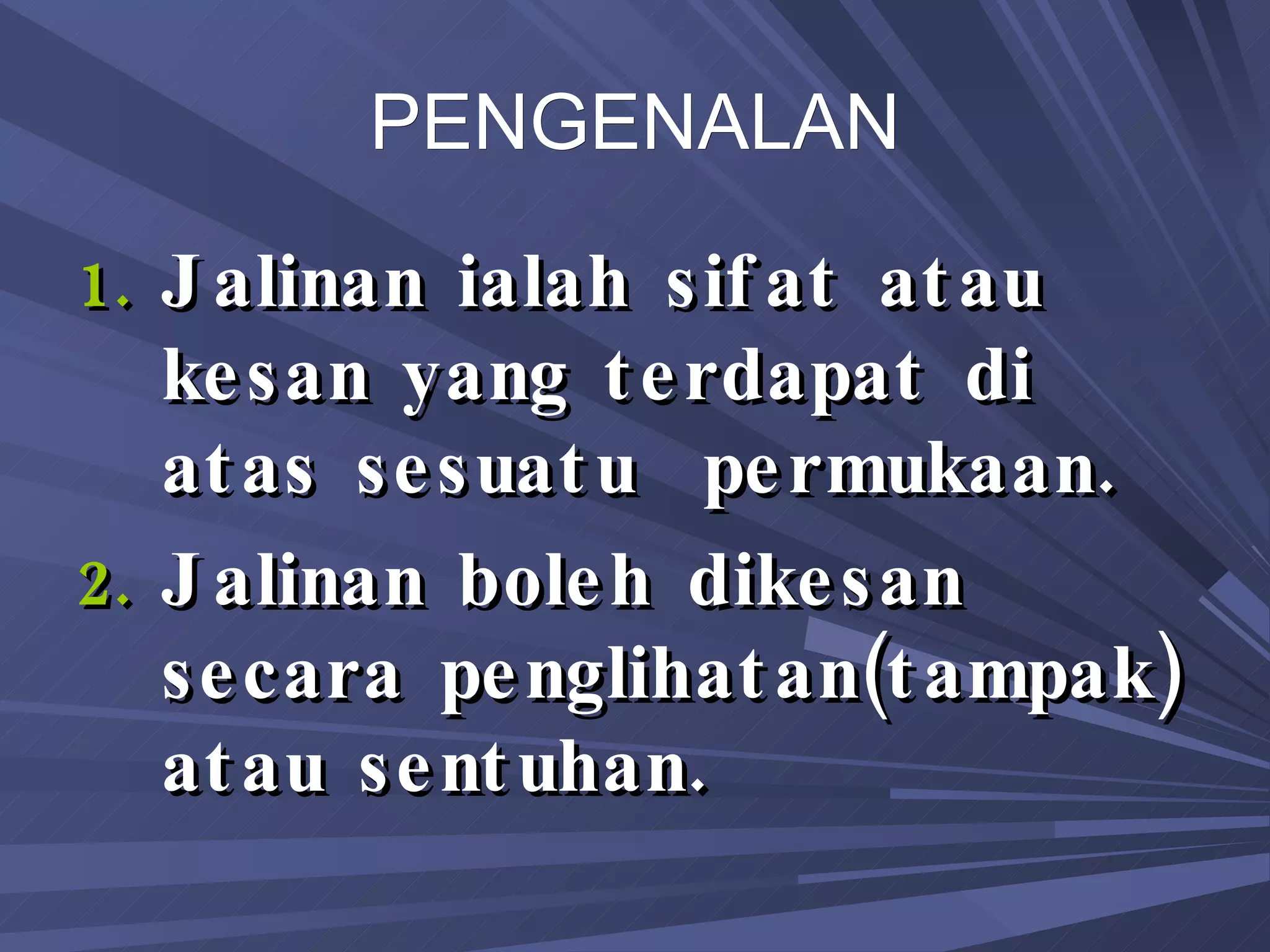 Dokumen ini membahas pengenalan jalinan sebagai sifat atau kesan pada permukaan yang dapat dikesan melalui penglihatan atau sentuhan. Jalinan terbagi menjadi jalinan sentuh, seperti permukaan tayar dan kulit durian, dan jalinan tampak, yang dapat dilihat tetapi tidak dapat dirasa. Fungsi jalinan mencakup penyataan, hiasan, manipulasi pelukis, penciptaan ruang, serta perlindungan dan keselamatan.