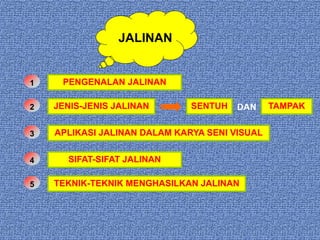 Dokumen ini membahas tentang jalinan, termasuk jenis-jenisnya seperti jalinan sentuh dan tampak serta aplikasinya dalam karya seni visual seperti lukisan, cetakan, dan ukiran. Jalinan sentuh melibatkan sensasi fisik, sementara jalinan tampak hanya terlihat secara visual. Selain itu, dokumen ini juga menjelaskan teknik-teknik untuk menghasilkan jalinan.