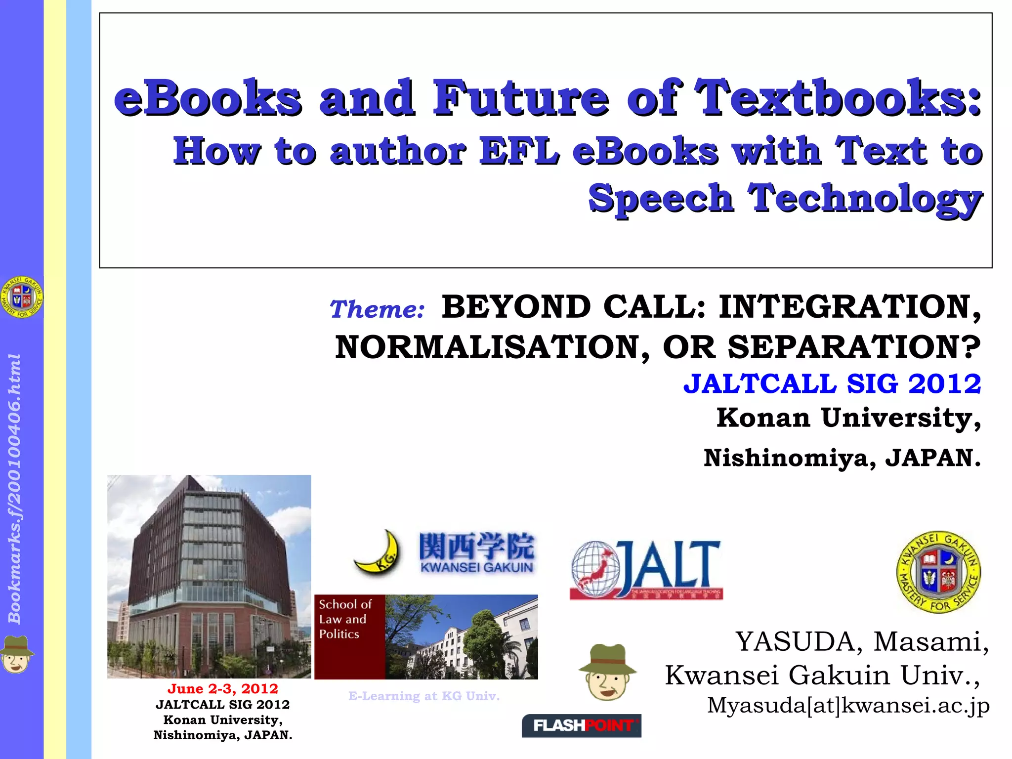This document discusses the use of iPads for language learning and as eBook readers. It provides examples of how iPads can be used in Web Enhanced Language Learning (WELL) projects, both in the classroom with the teacher presenting and for autonomous student learning. The document compares eBooks to other media like printed books, audio books, blogs and PDFs. It also discusses eBook formats, text-to-speech applications for iPads, and the potential of eBooks and dedicated eBook readers to become future textbooks.