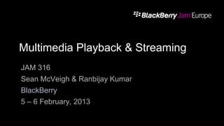 This document provides an overview of multimedia playback and streaming capabilities on the BlackBerry 10 platform. It discusses the multimedia APIs available, including the Cascades and Multimedia Renderer APIs. It covers supported formats, streaming protocols, digital rights management options, and sample code snippets demonstrating basic playback and event handling. The document also discusses integrating multimedia into applications, such as using the media previewer or sharing capabilities.