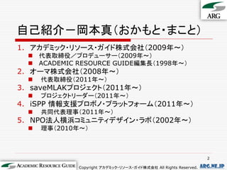 代表取締役/プロデューサー(2009年~) ACADEMIC RESOURCE GUIDE編集長(1998年~) 2. オーマ株式会社(2008年~) 代表取締役(2011年~) 3. saveMLAKプロジェクト(2011年~) プロジェクトリーダー(2011年~) 4. iSPP 情報支援プロボノ・プラットフォーム(2011年~) 共同代表理事(2011年~) 5. NPO法人横浜コミュニティデザイン・ラボ(2002年~) 理事(2010年~) 2 Copyright アカデミック・リソース・ガイド株式会社 All Rights Reserved. arg.ne.jp