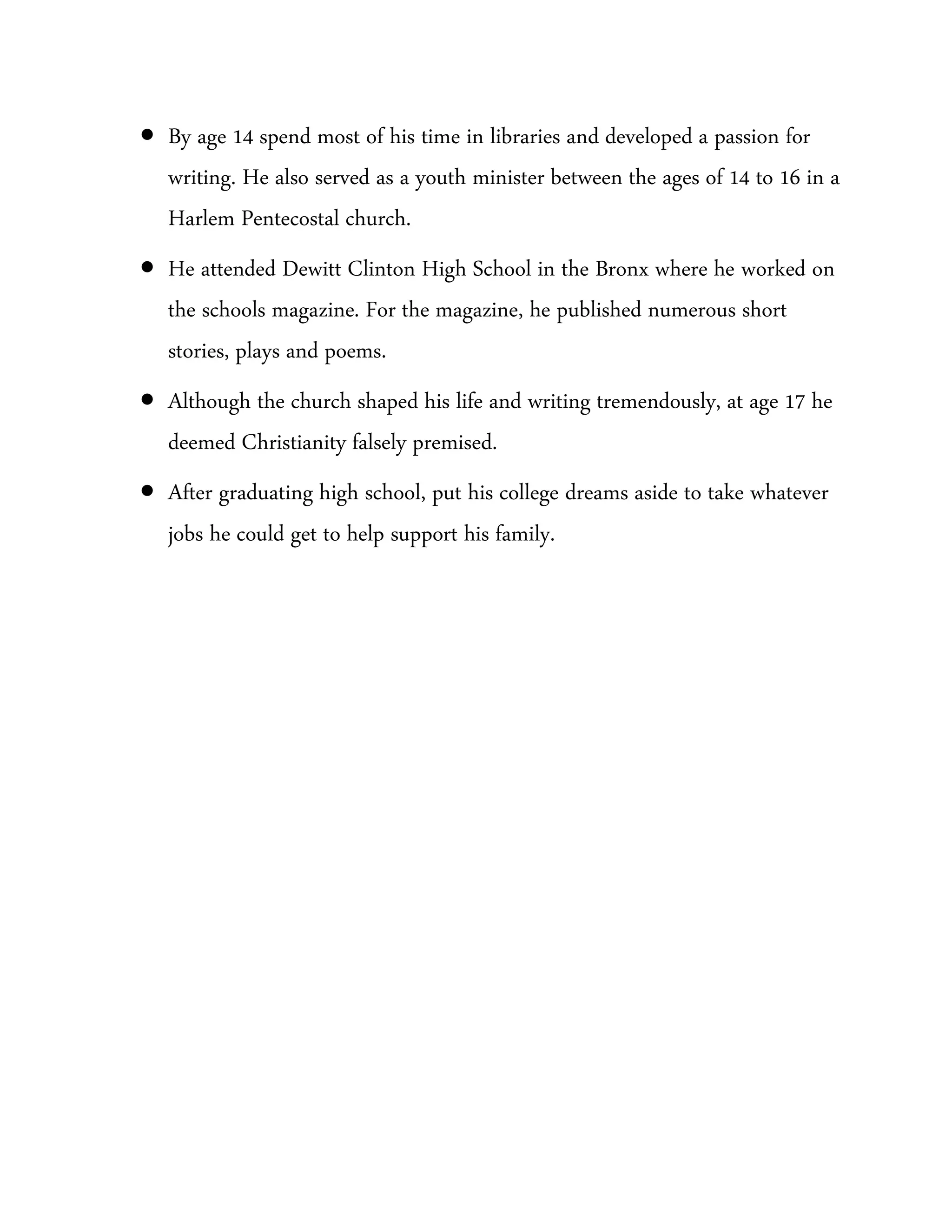 James Baldwin was an American writer born in 1924 in Harlem, New York. He grew up in poverty with his mother and eight siblings. Baldwin developed a passion for writing at a young age and served as a youth minister in his teens. Though the church shaped his life, he rejected Christianity at age 17. After high school, Baldwin took odd jobs to support his family instead of attending college. He explored themes of race, identity, and social issues in his influential writings.