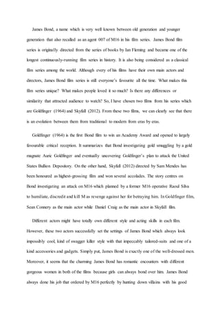 This document provides a compare and contrast analysis of the James Bond films Goldfinger (1964) and Skyfall (2012). Both films feature iconic Bond actors Sean Connery and Daniel Craig respectively. While the technologies and fighting scenes evolved between the films, some classic Bond elements remained the same, like his well-dressed style. Both films also featured Bond changing enemy women, Pussy Galore and Severine, to his side. Overall, the document analyzes the similarities that have made the James Bond film series appealing for audiences over the decades.
